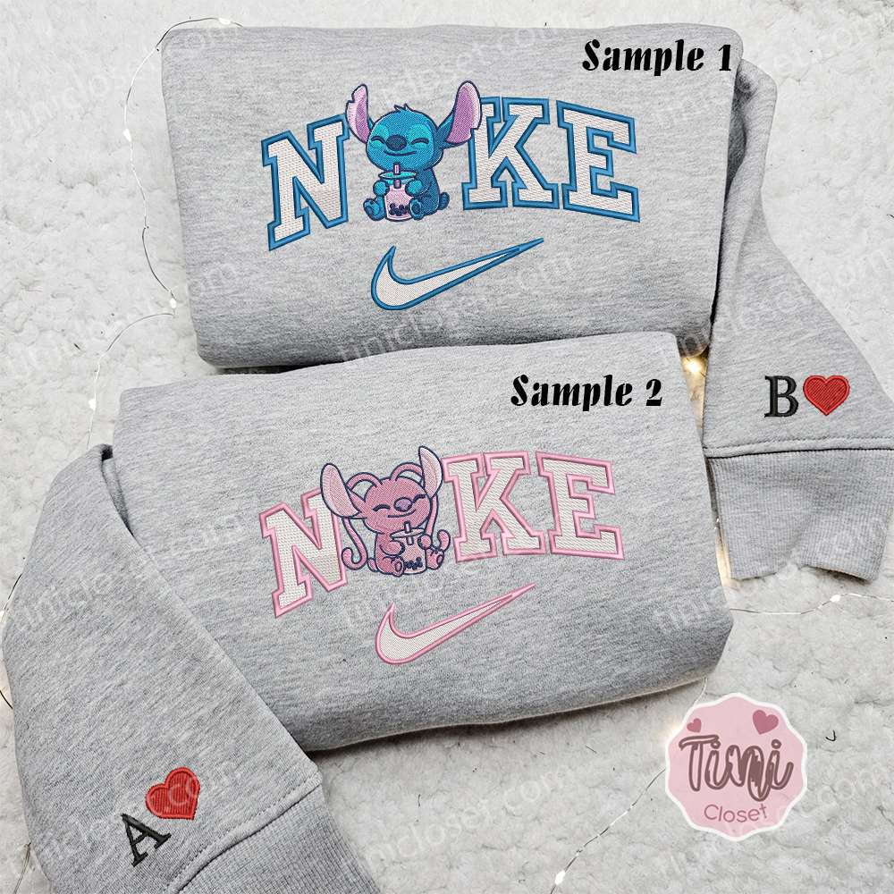 Nike Couple Stitch Angel Milk Tea Embroidered Shirt, Disney Couple Embroidered Hoodie, Best Couple Embroidered Sweatshirt