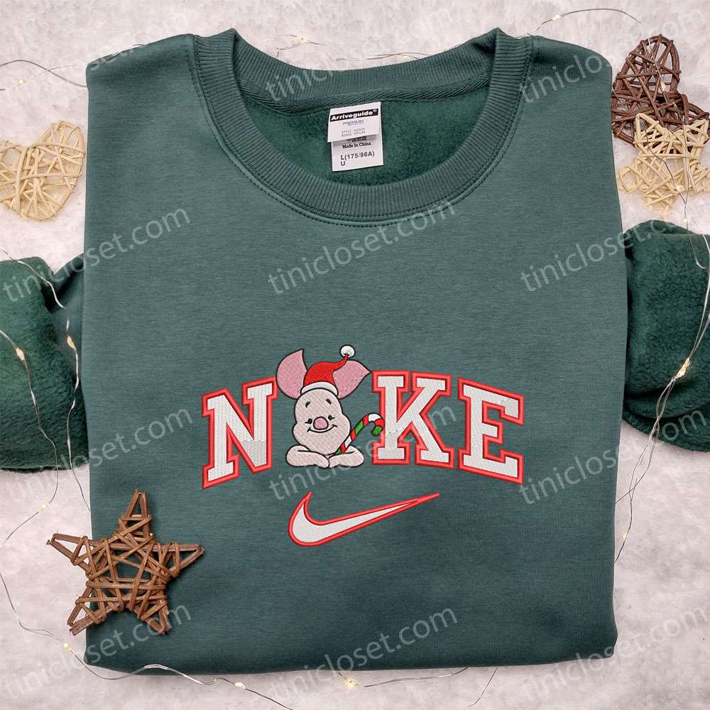 Nike X Piglet Candy Cane Christmas Embroidered Shirt, Winnie The Pooh Disney Embroidered Hoodie, Christmas Embroidered T-shirt