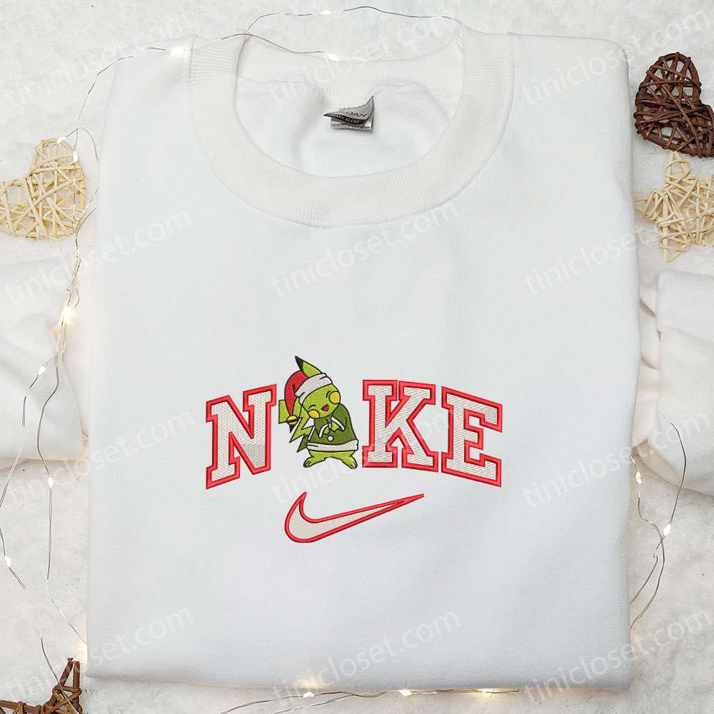 Nike X Pikachu Grinch Christmas Santa Embroidered Sweatshirt, Pokemon Anime Embroidered Shirt, Christmas Embroidered Hoodie
