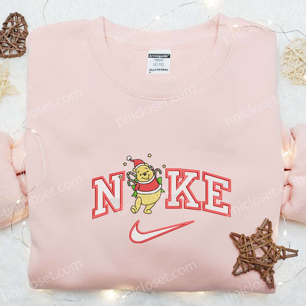 Nike X Pooh Candy Cane Christmas Embroidered Shirt, Winnie The Pooh Disney Embroidered Shirt, Christmas Embroidered T-shirt