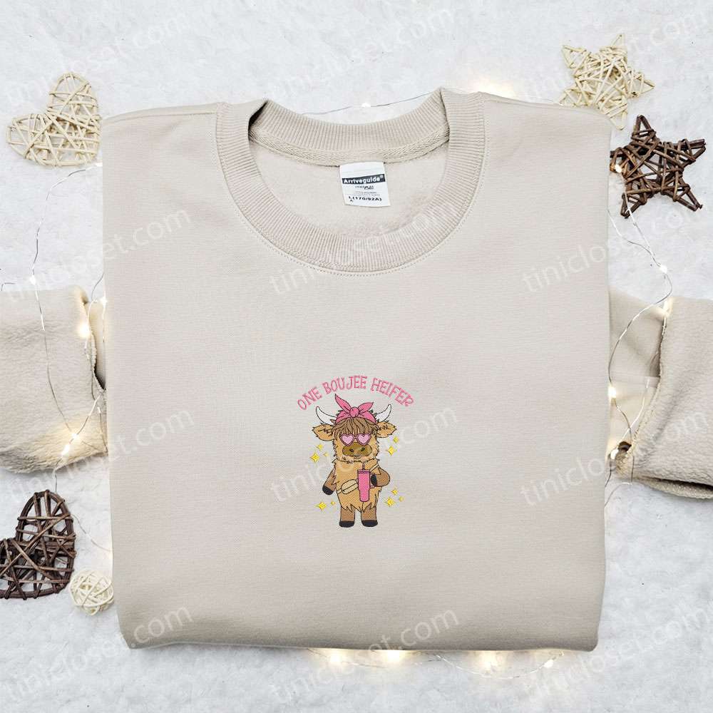 One Boujee Heifer Highland Cow Embroidered Shirt, Animal Embroidered Hoodie, Best Gift Idea