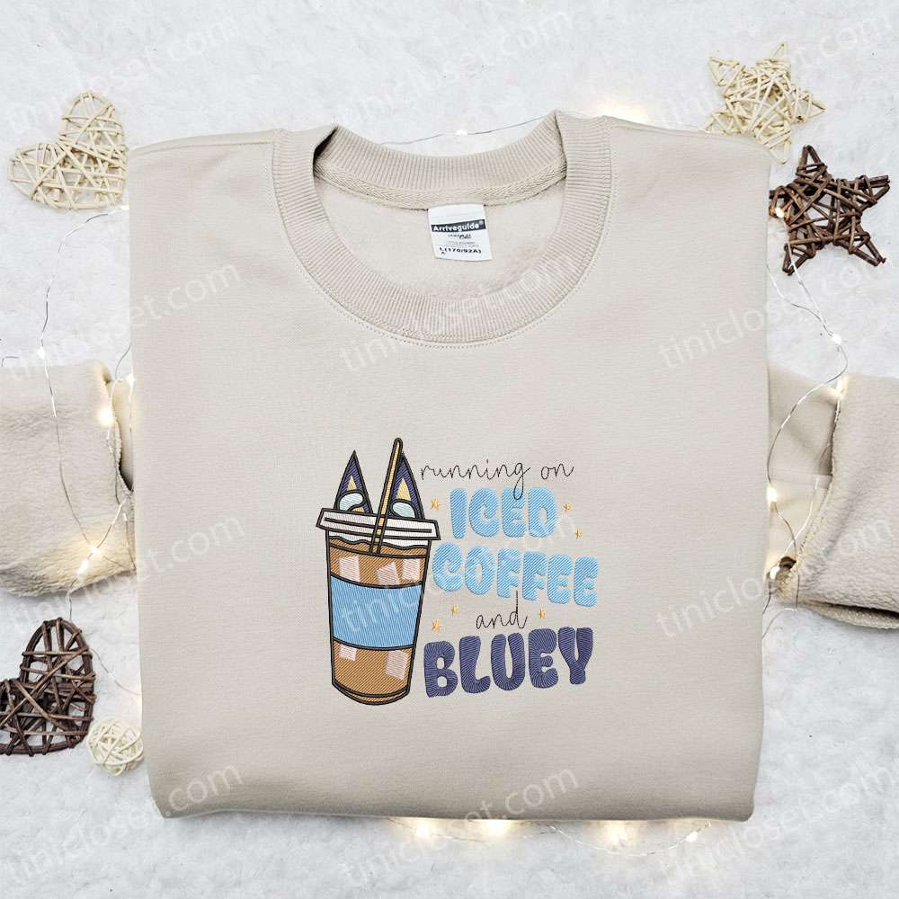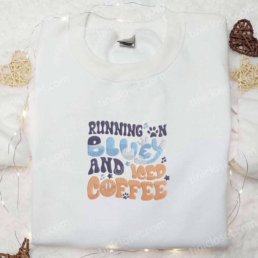 Running On Iced Coffee And Bluey Embroidered Shirt, Cartoon Embroidered Hoodie, Best Gift Idea