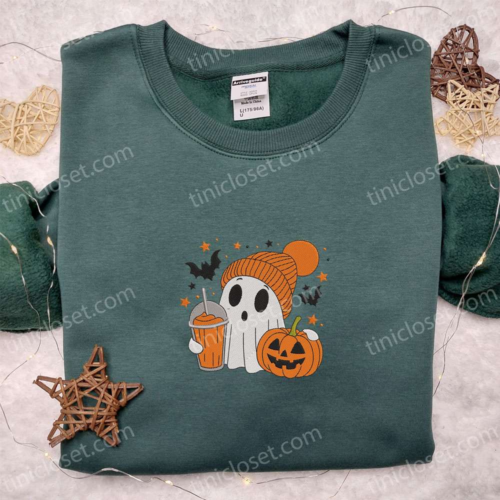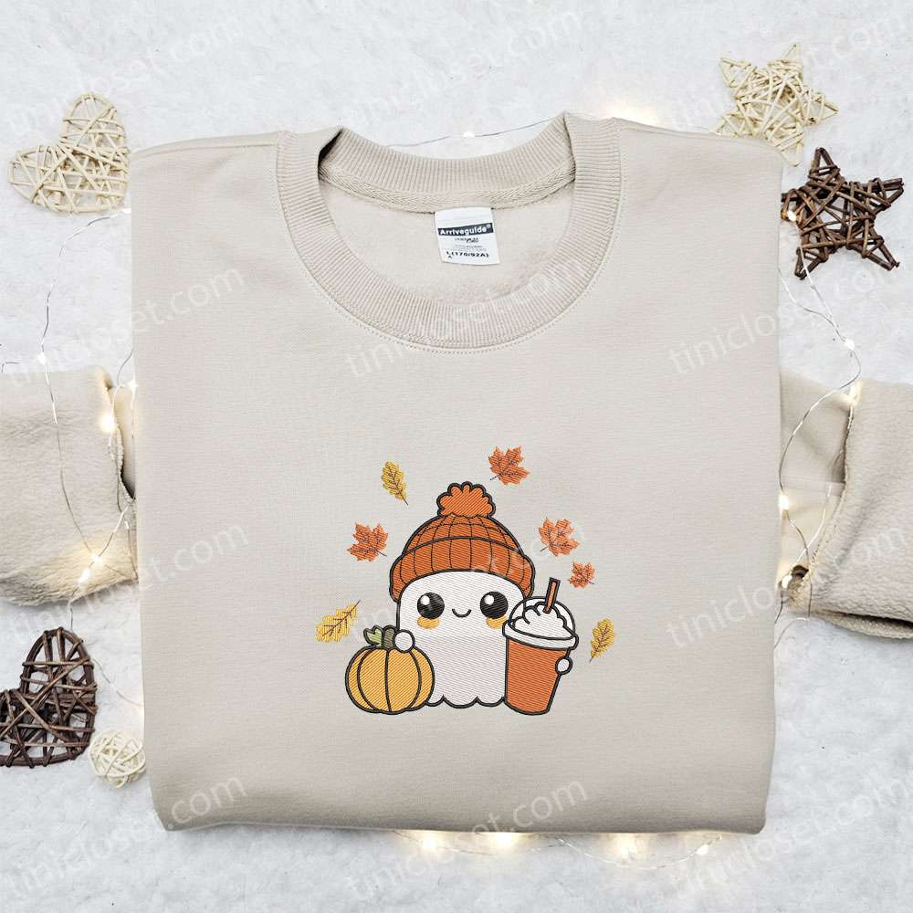 Cute Ghost Autumn Fall Pumpkin Drink Halloween Embroidered Shirt