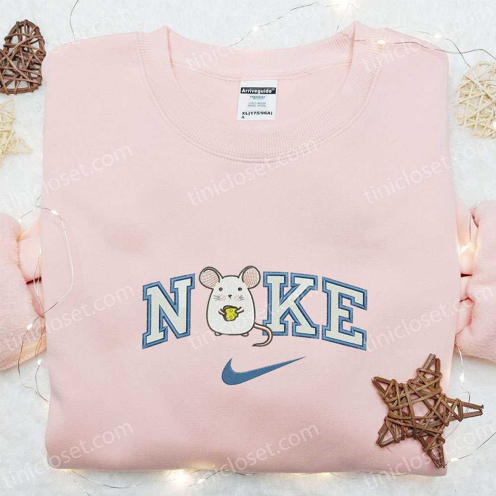 Cute White Mouse With Cheese X Nike Embroidered Shirt, Cartoon Embroidered Hoodie, Nike Inspired Embroidered T-shirt