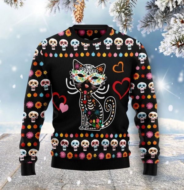 Day Of The Dead Black Cat Ugly Christmas Sweater