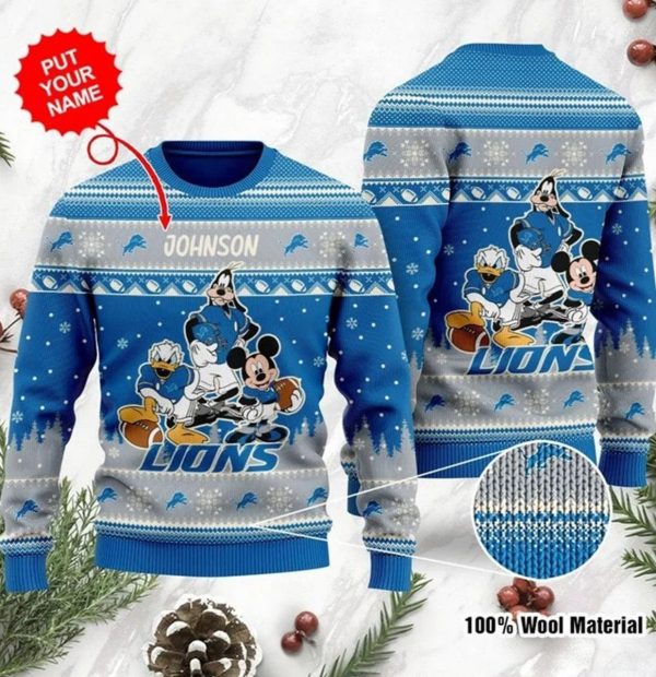 Detroit Lions Disney Donald Duck Mickey Mouse Goofy Personalized Ugly Christmas Sweater