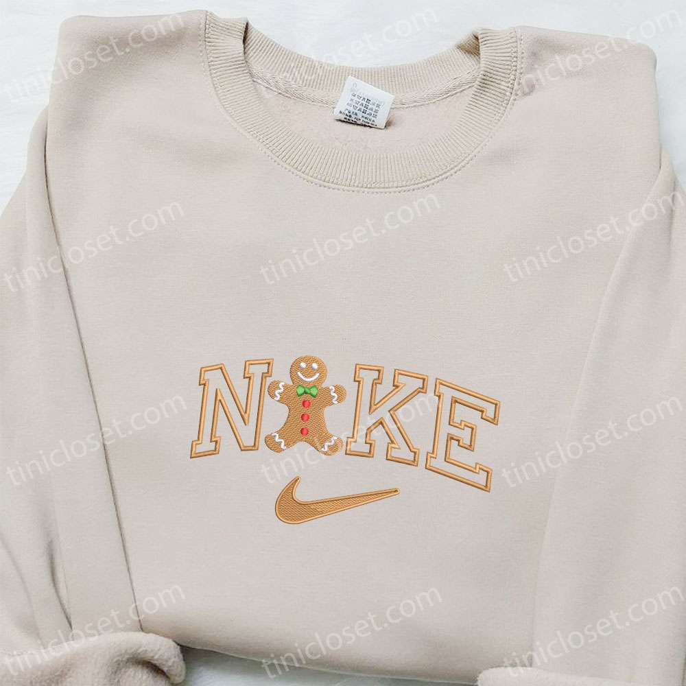 Gingerbread Man Happy X Nike Embroidered Shirt, Christmas Embroidered Sweatshirt, Nike Inspired Embroidered Hoodie